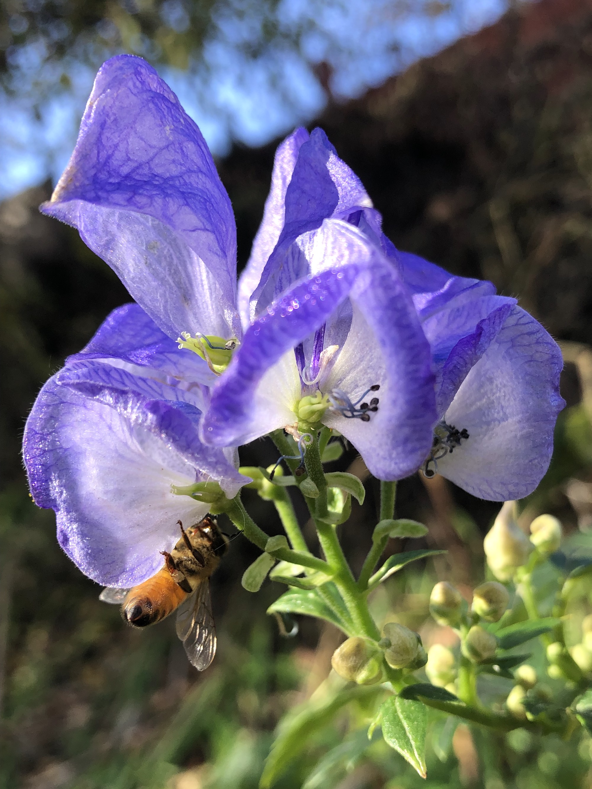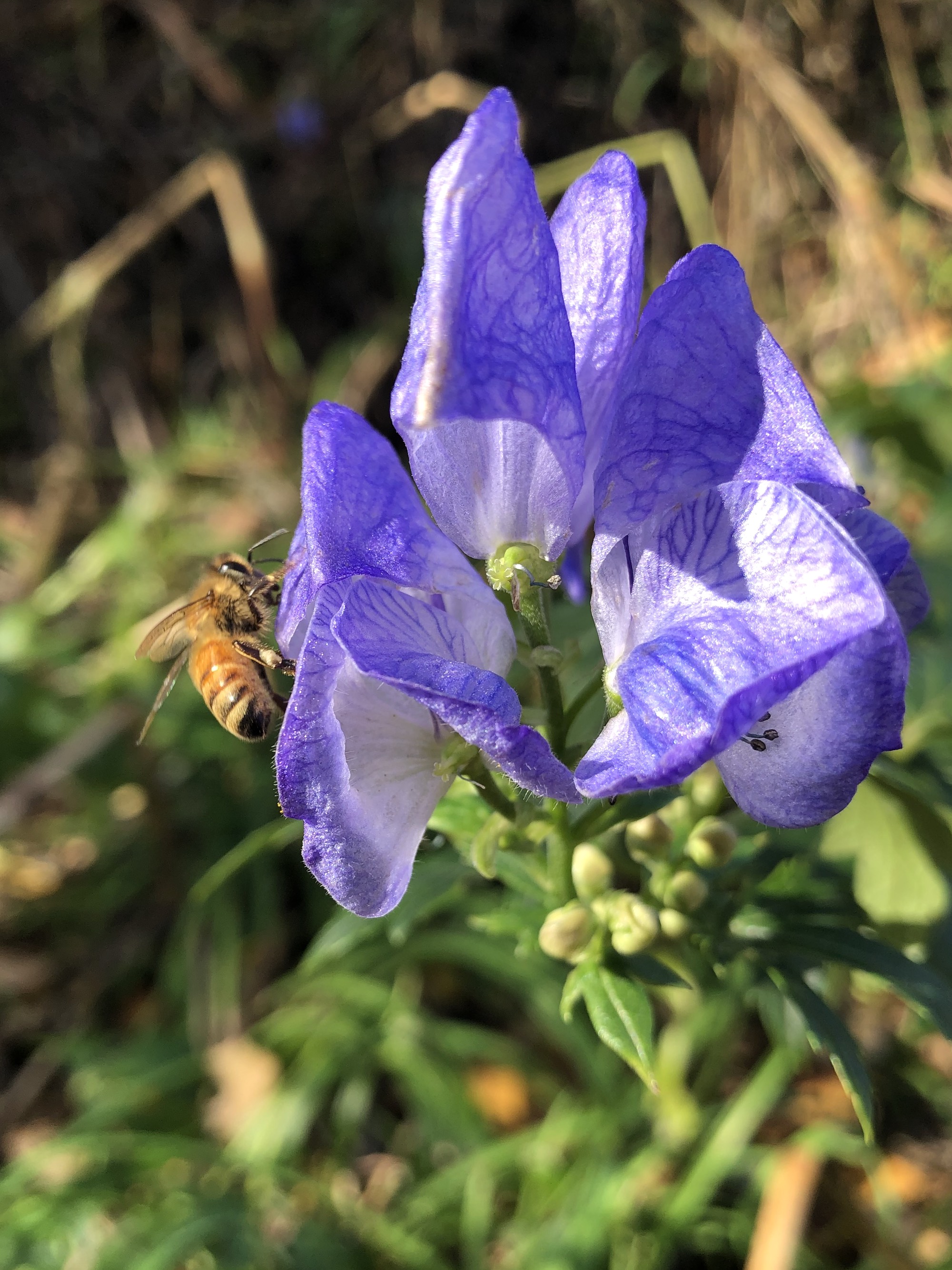 Above: Honey bee on Monkshood on hill off of bike path behind Fox Avenue in Madison, Wisconsin (10/28/22).