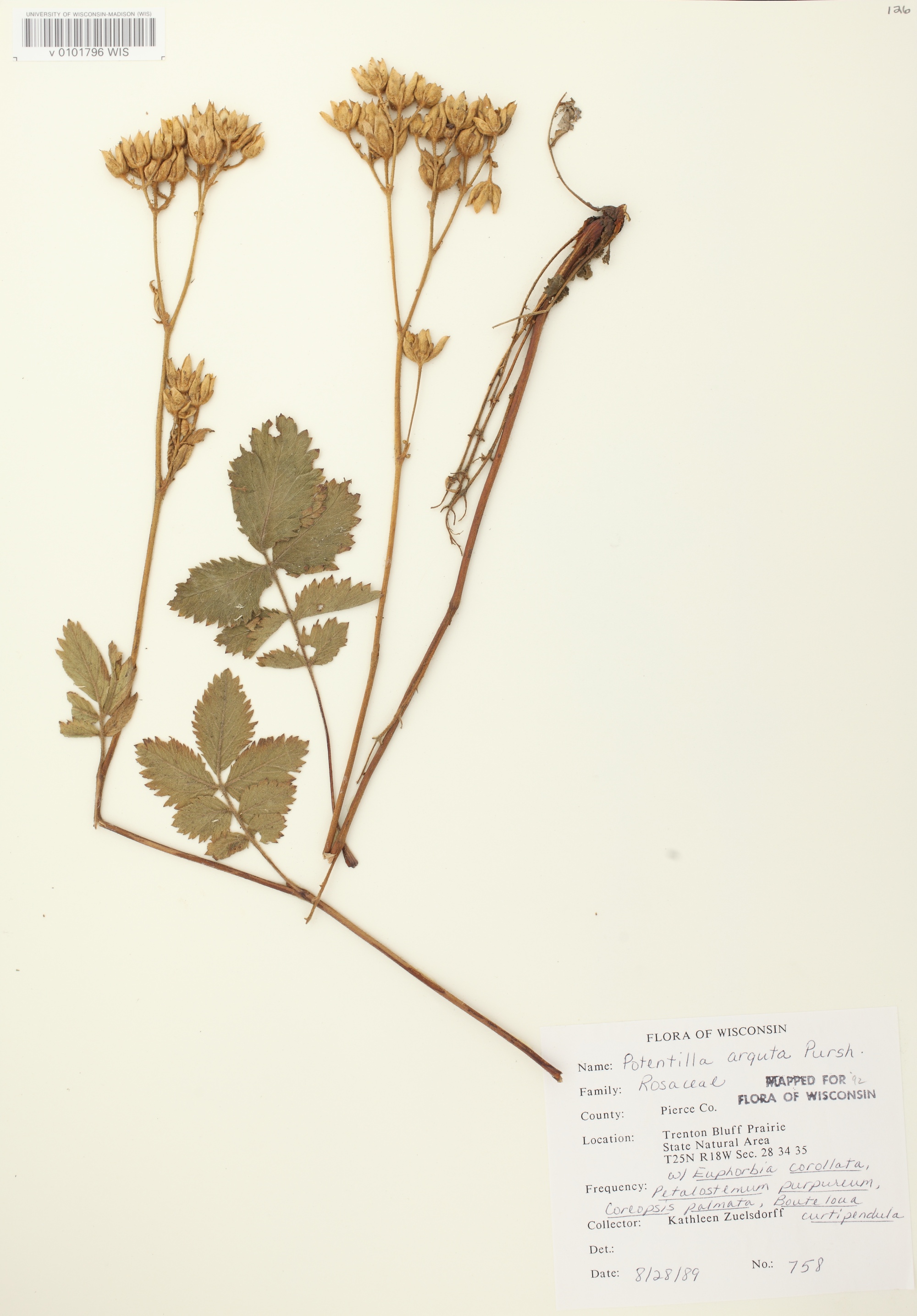 Above: Prairie Cinquefoil specimen collected in Pierce County in the Trenton Bluff Area on August 28, 1989.