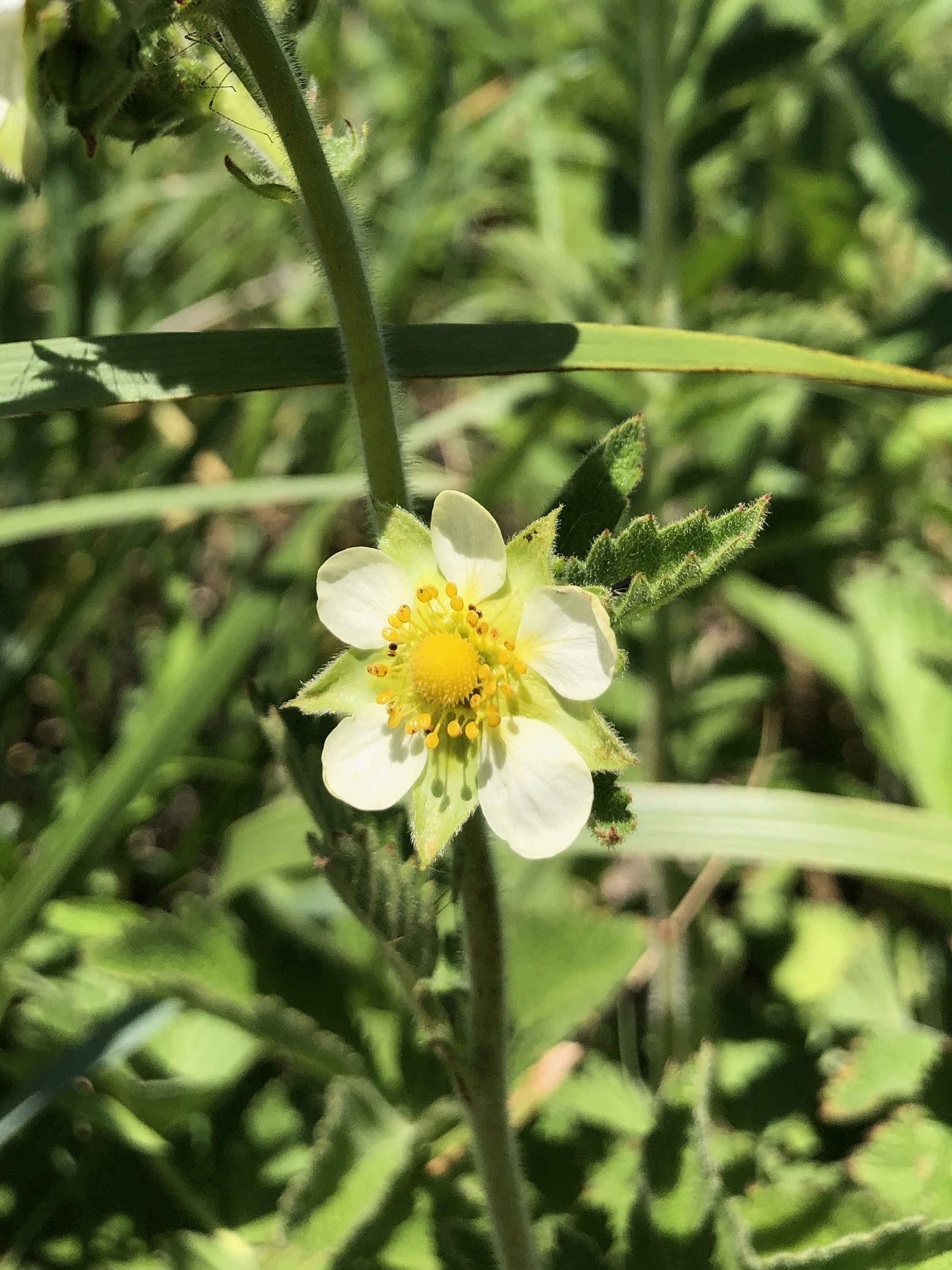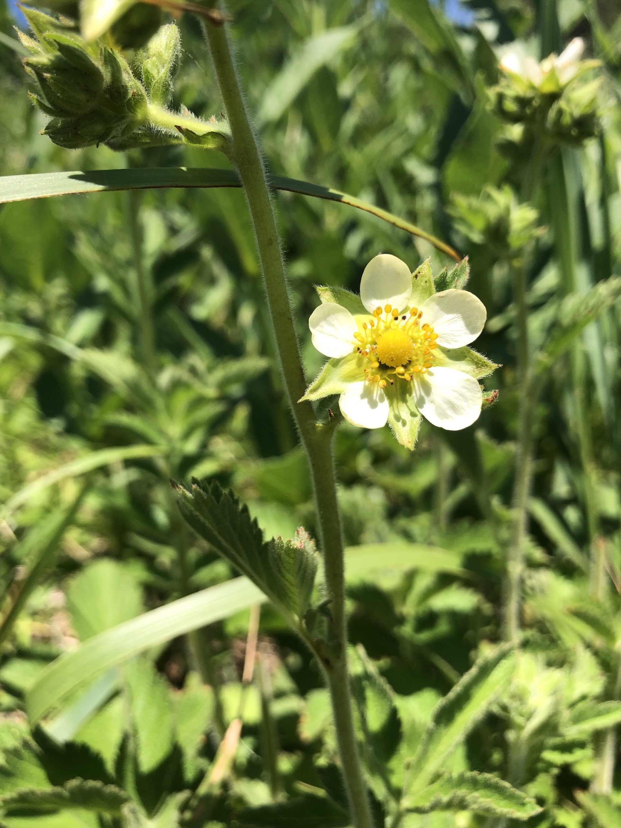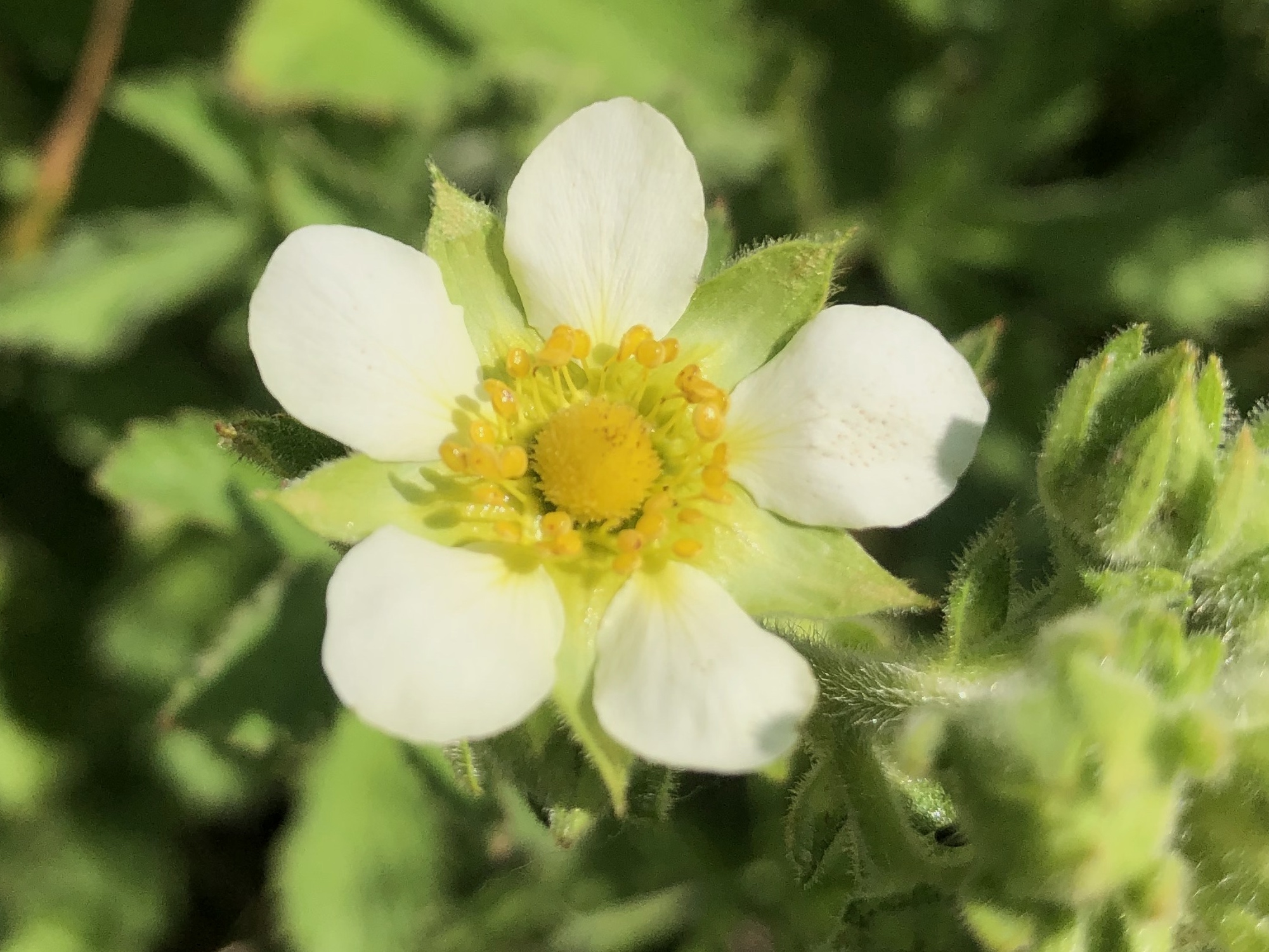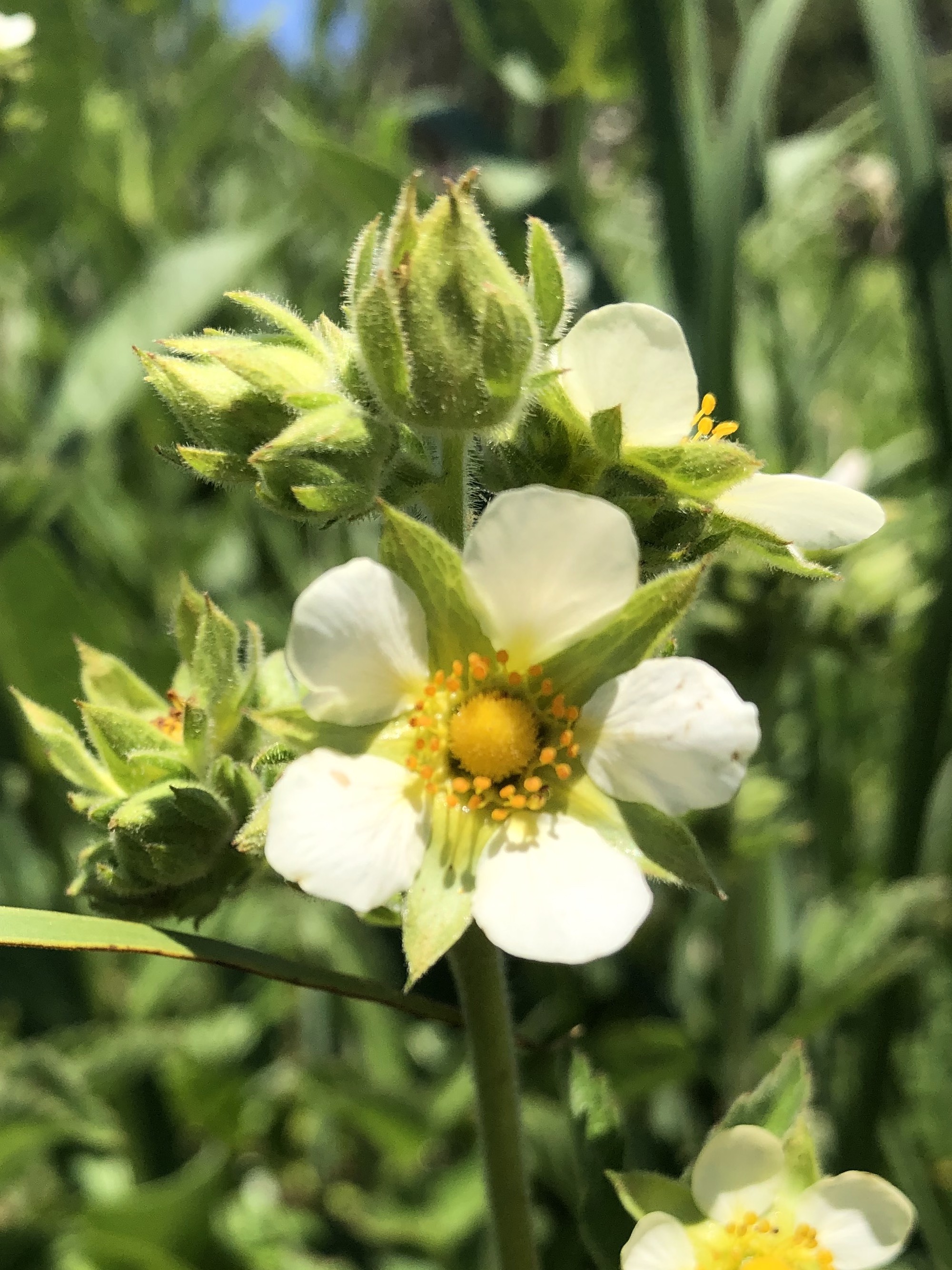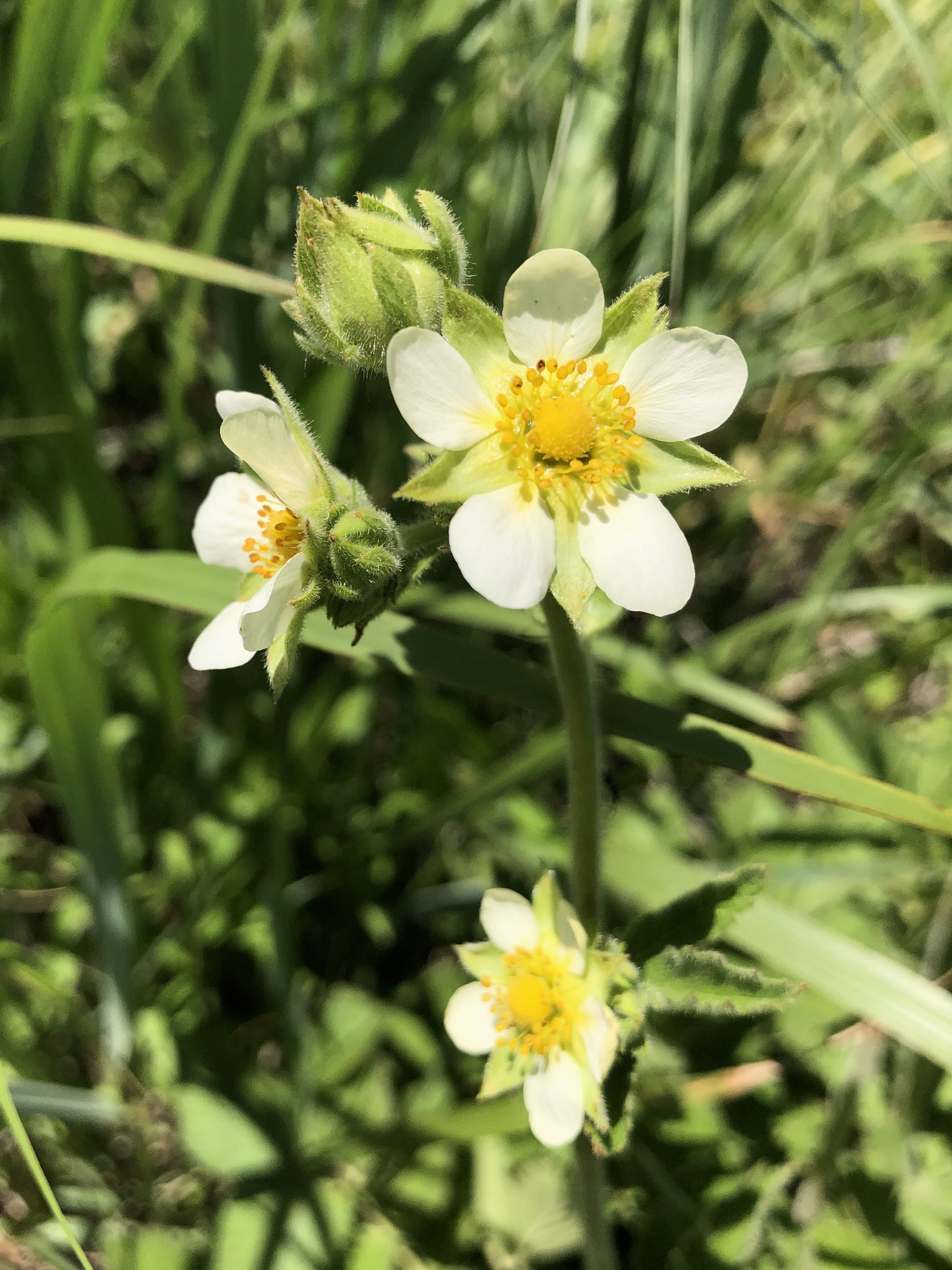 The strawberry-like, white flowers are arranged in a tight cluster on a long stem. They have five white or cream ovate petals, five pointed green sepals between the petals, and a round head of pistils in the center with more than 20 stamens in a ring around it.