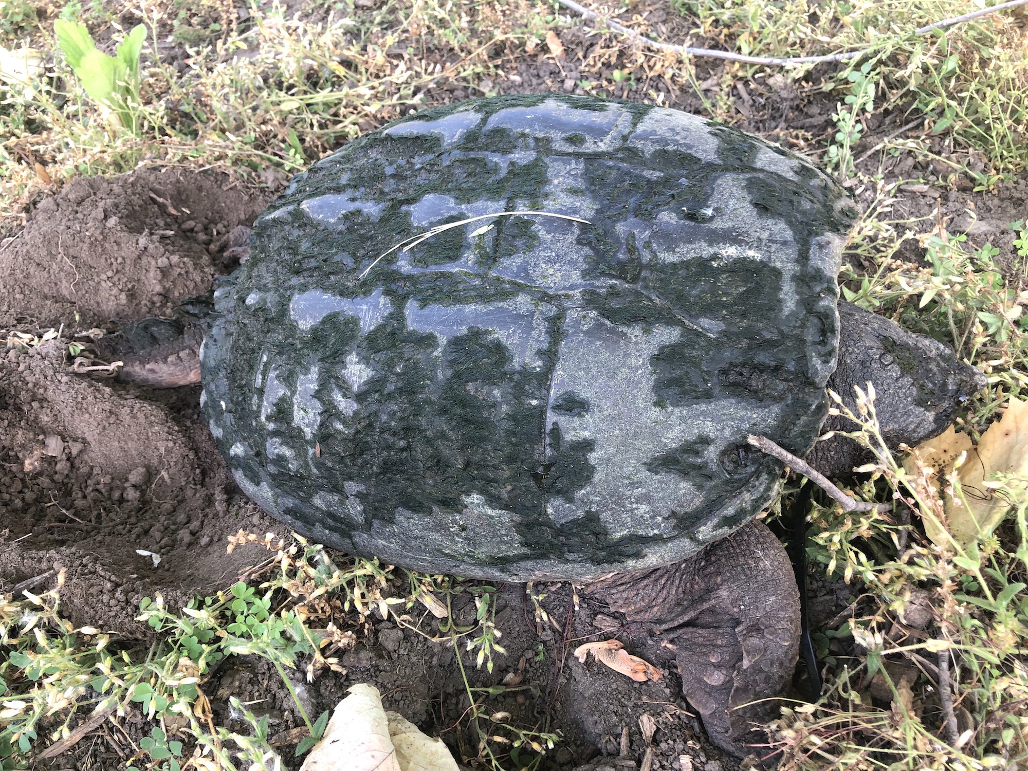 Above: Snapping Turtle about 18" long (estimated age 70 years+) laying eggs in E. Ray Stevens Pond and Aquatic Gardens on corner of Manitou Way and Nakoma Road in Madison, Wisconsin on June 6, 2021.